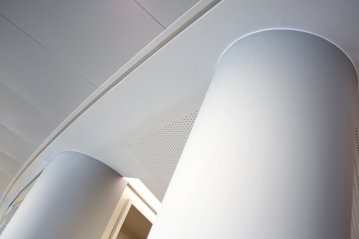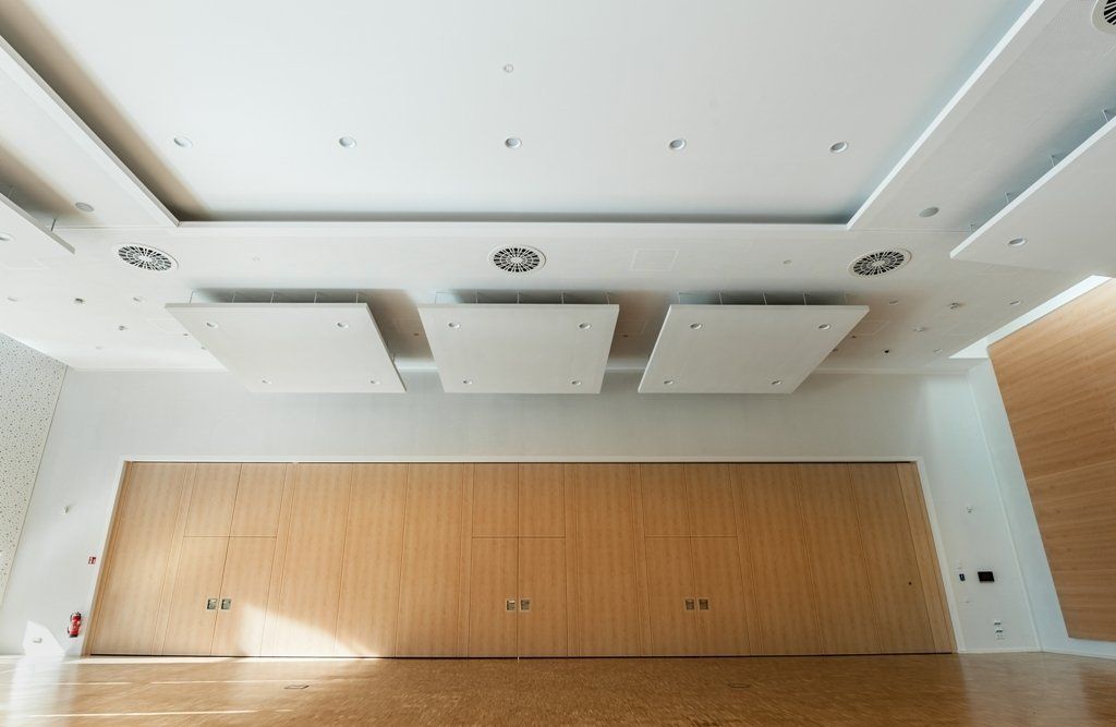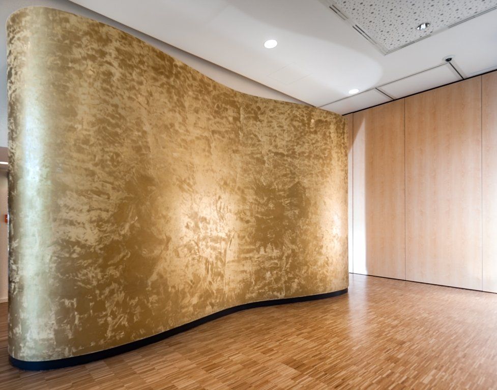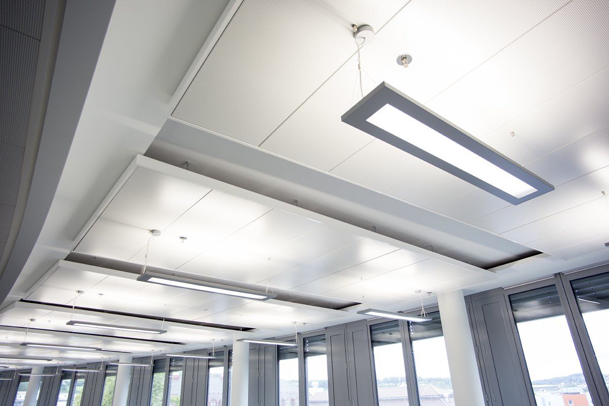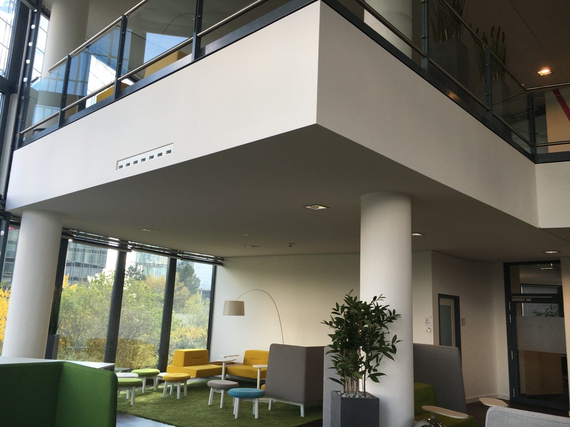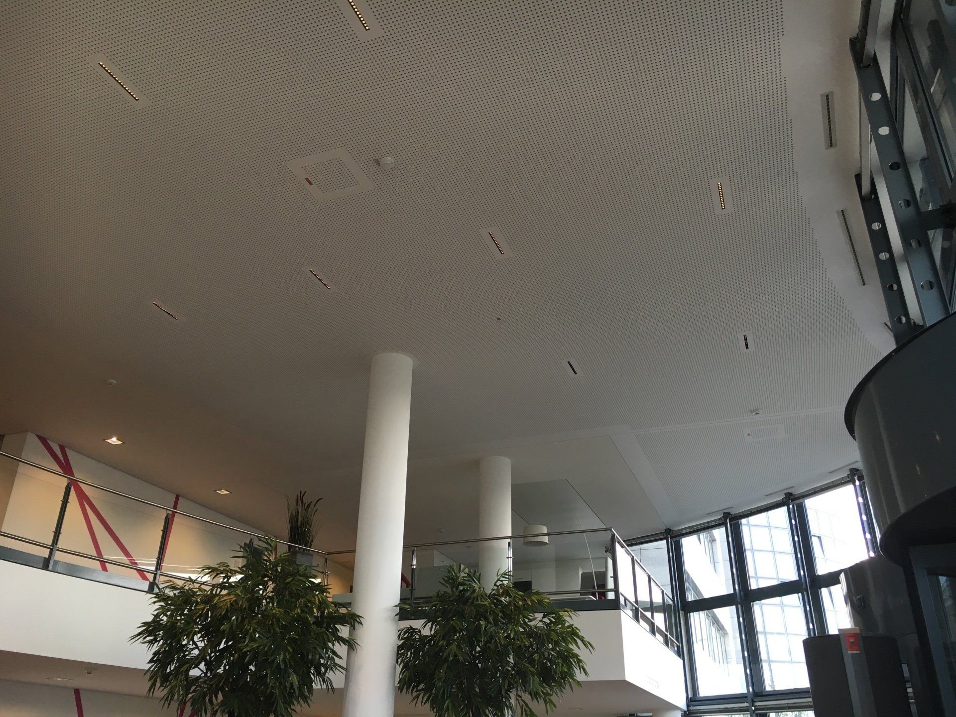 Ausführung: Abgehängte Decken als Heiz- und Kühldecken sowie Heiz- und Kühlsegel in geneigter Form ausgeführt, gekrümmten Wandelemente, Bauelemente mit hohen Anforderungen als Holz-Akustikwand-Verkleidungen schallabsorbierend und