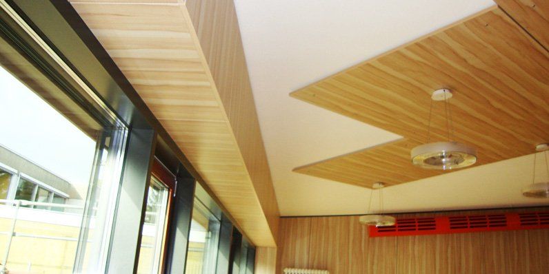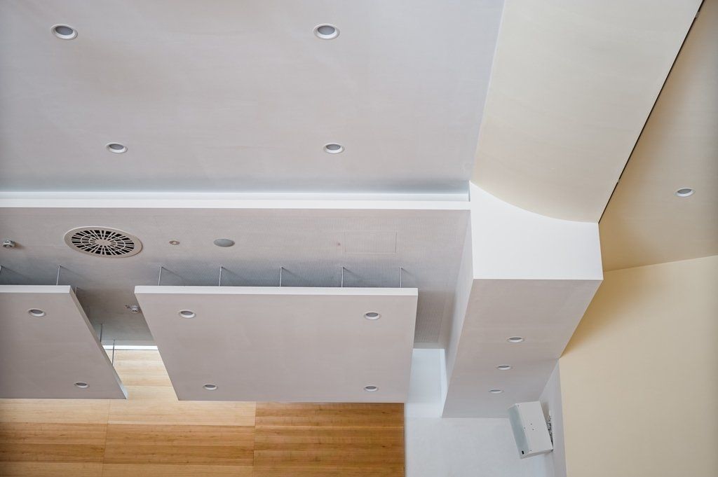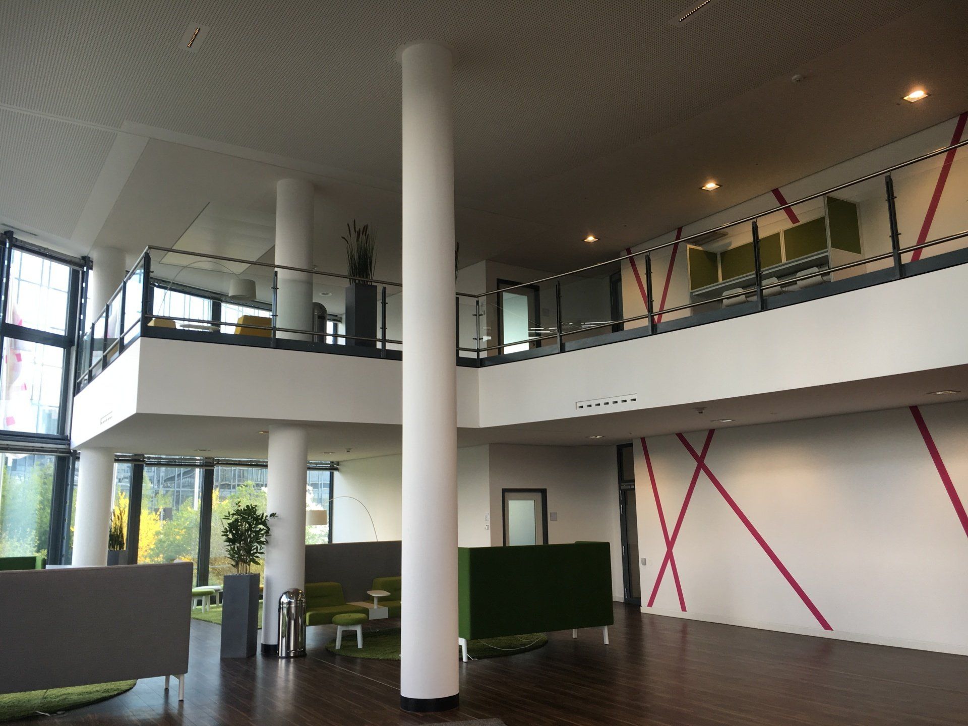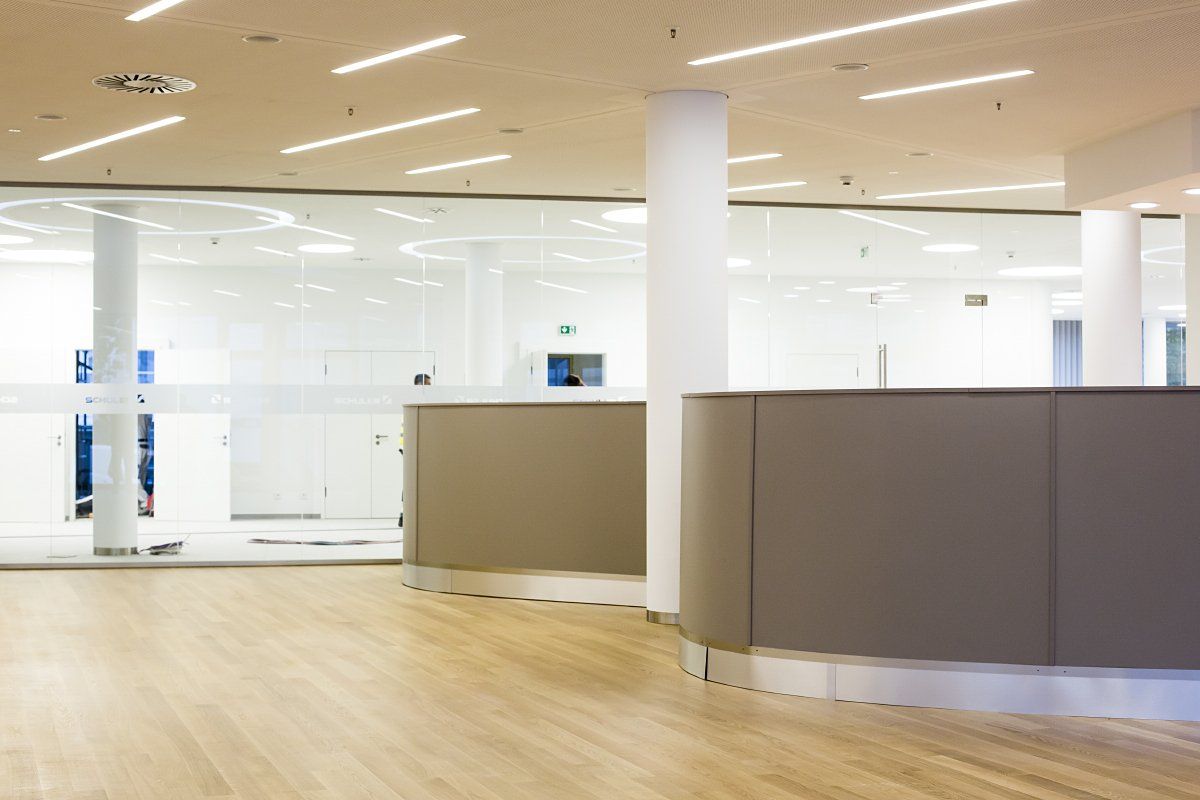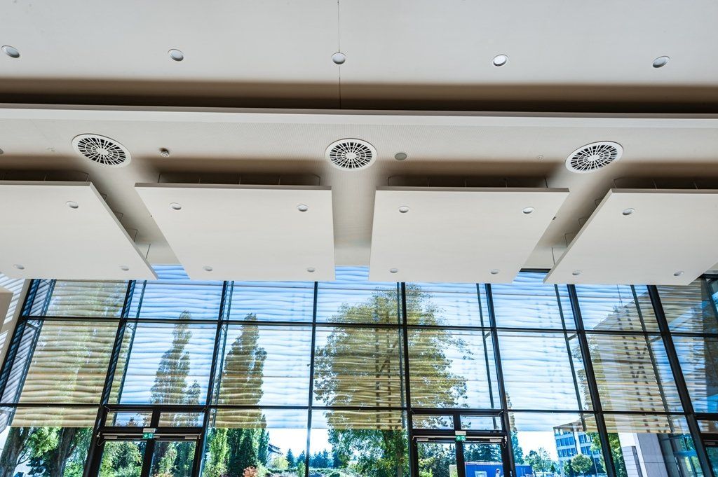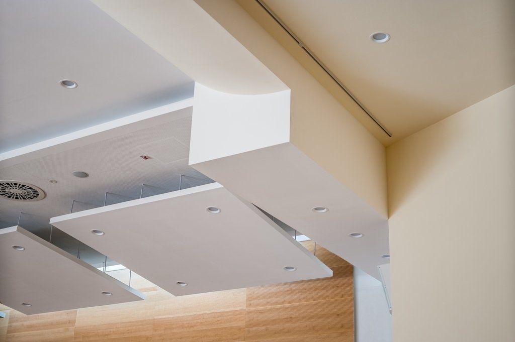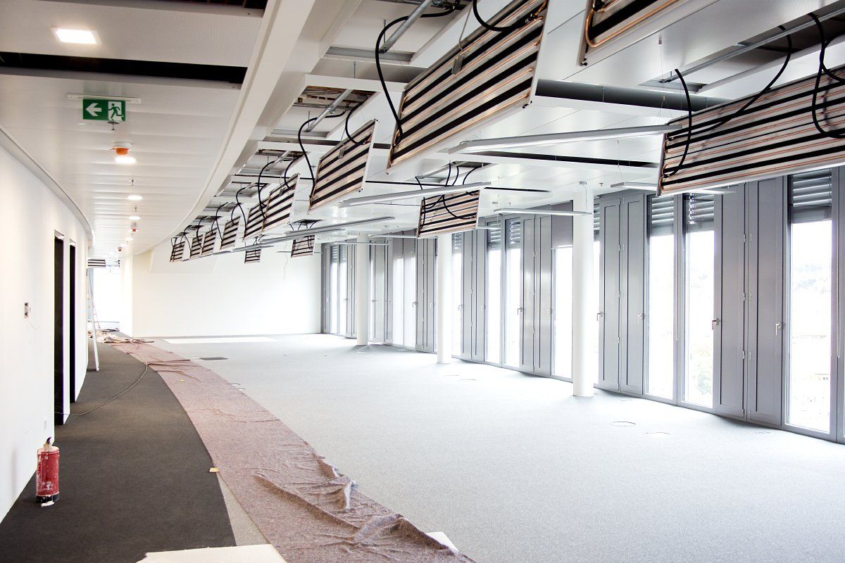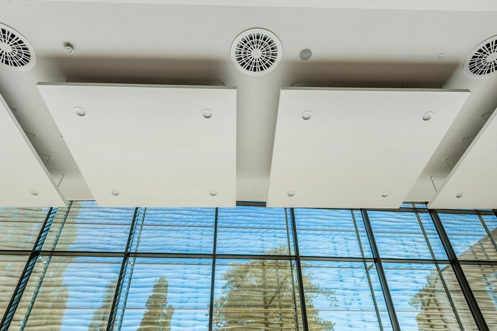 Ausführung: Abgehängte Decken als Heiz- und Kühldecken sowie Heiz- und Kühlsegel in geneigter Form ausgeführt, gekrümmten Wandelemente, Bauelemente mit hohen Anforderungen als Holz-Akustikwand-Verkleidungen schallabsorbierend und