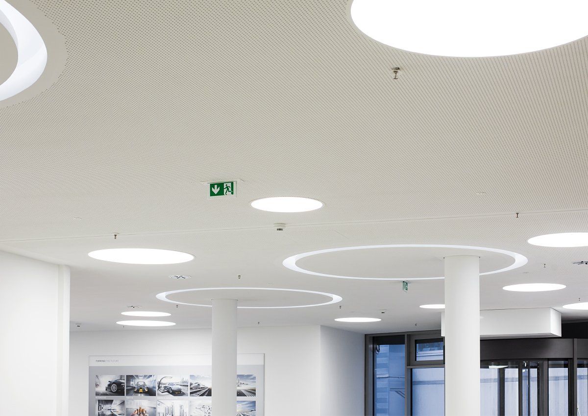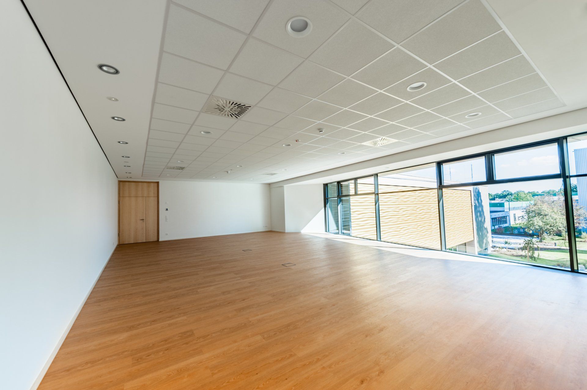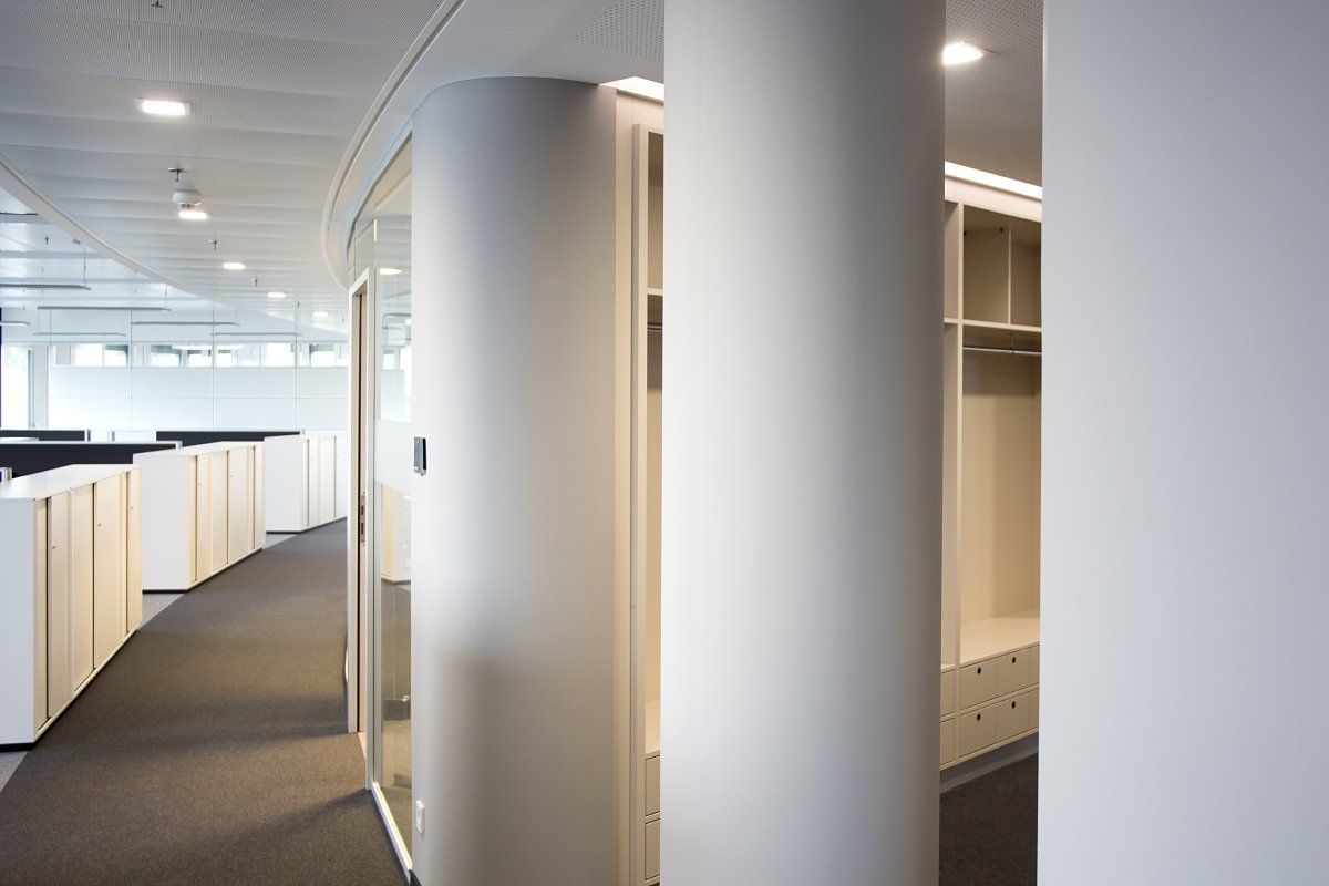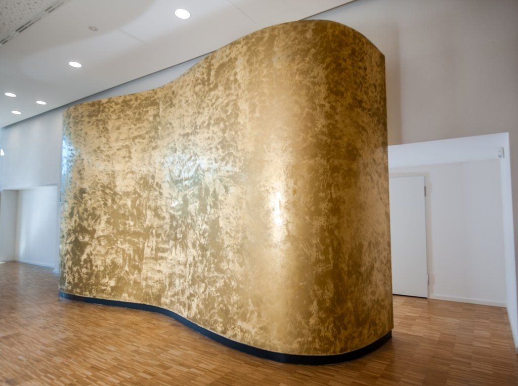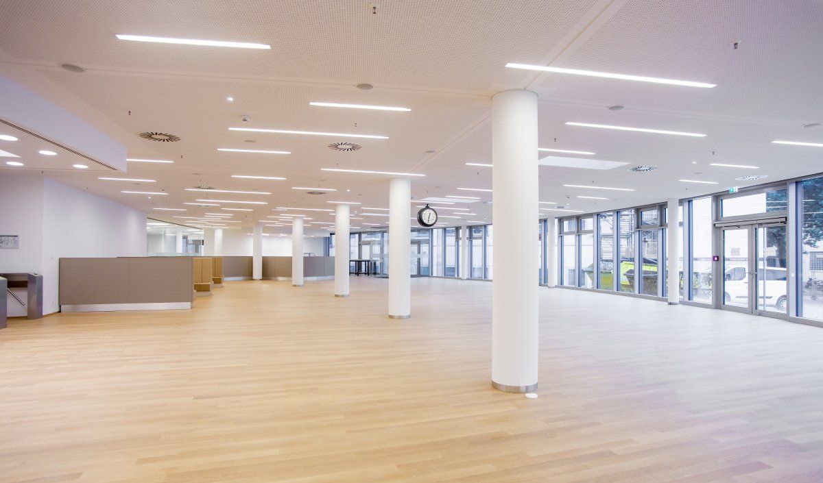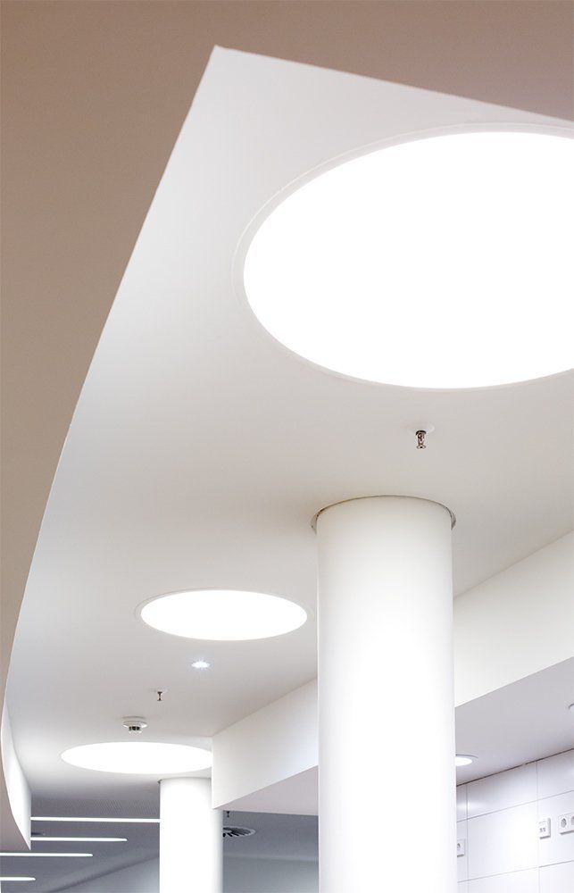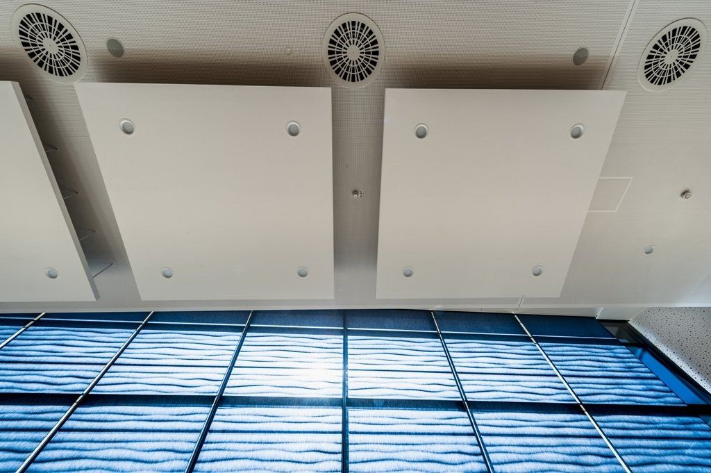 Ausführung: Abgehängte Decken als Heiz- und Kühldecken sowie Heiz- und Kühlsegel in geneigter Form ausgeführt, gekrümmten Wandelemente, Bauelemente mit hohen Anforderungen als Holz-Akustikwand-Verkleidungen schallabsorbierend und