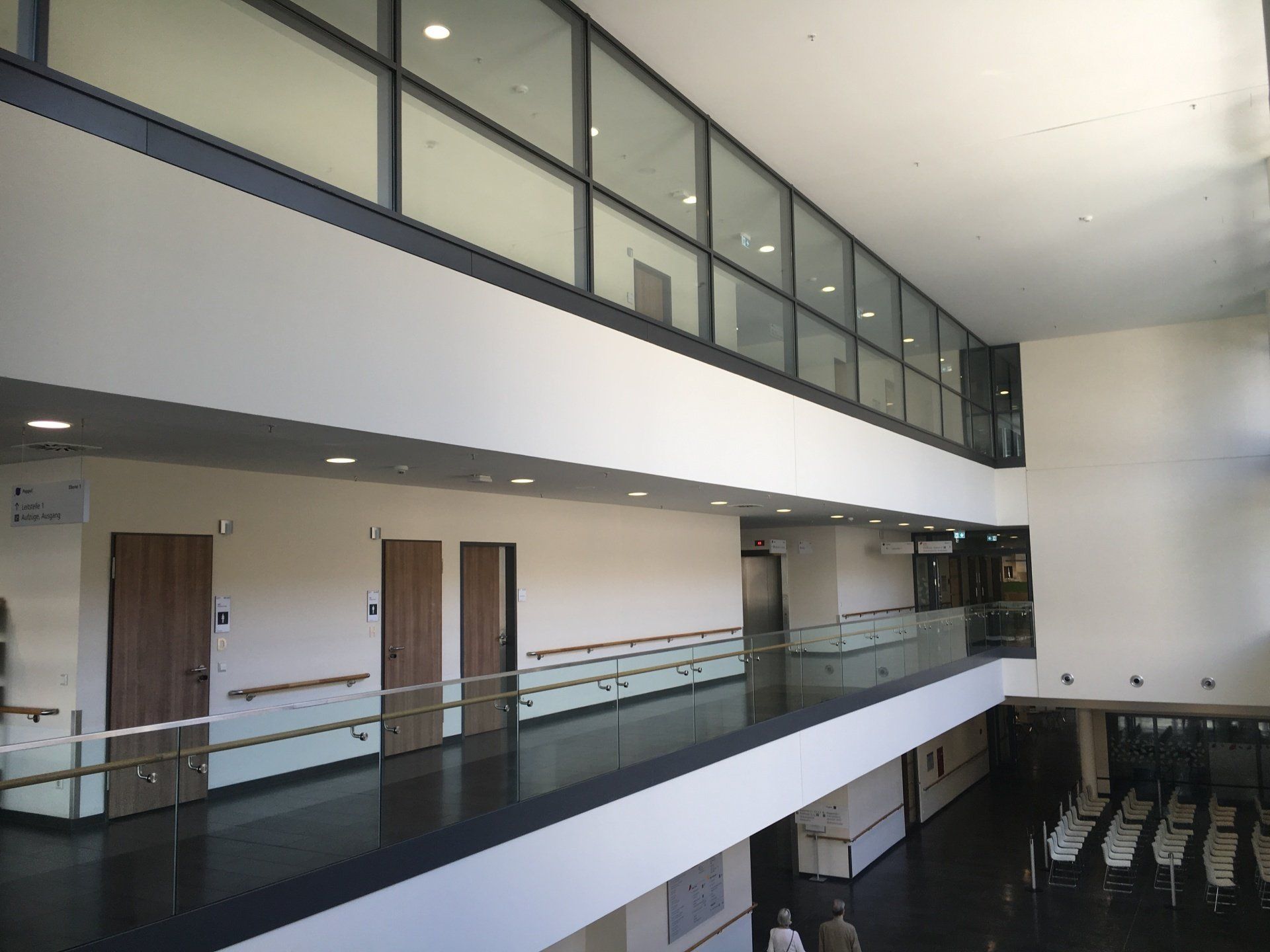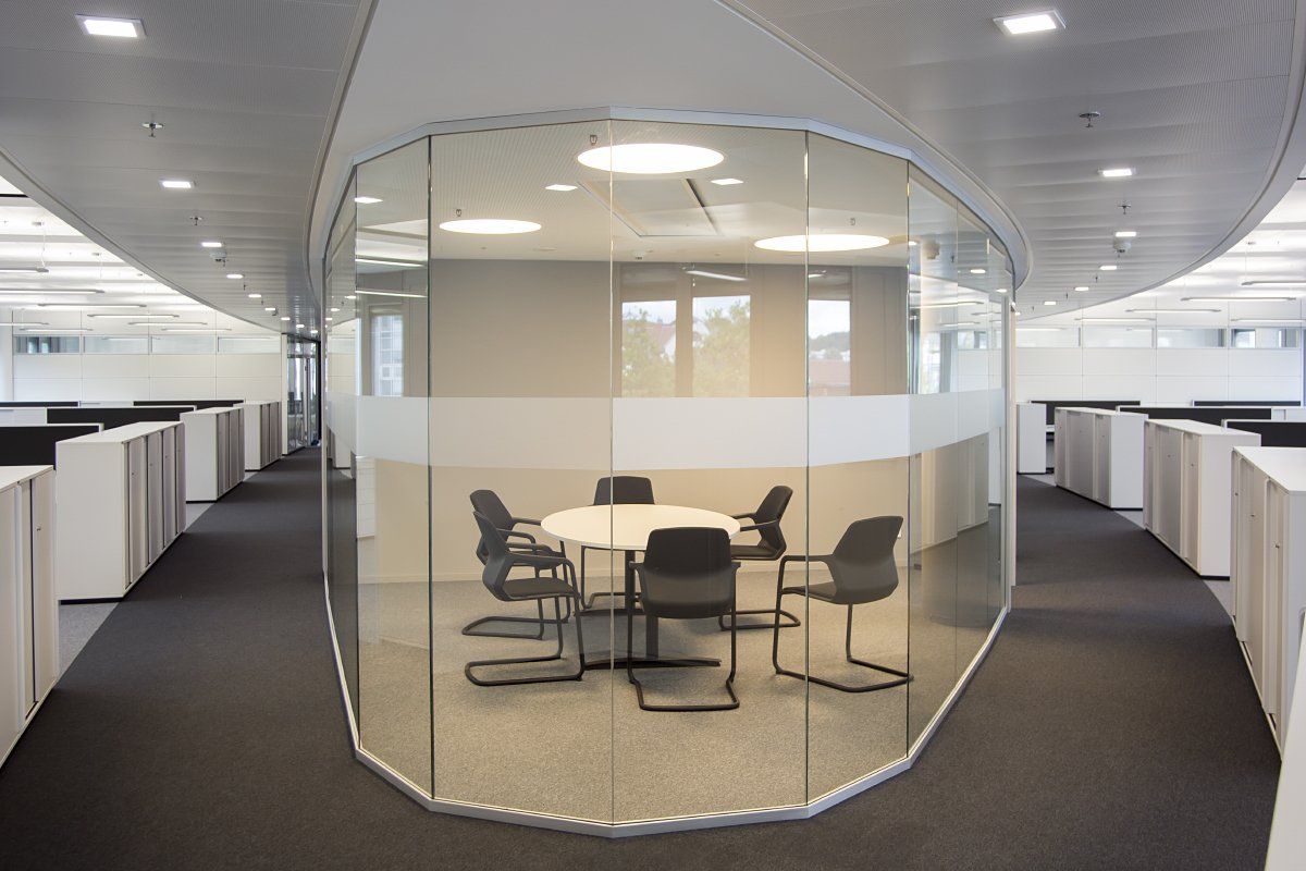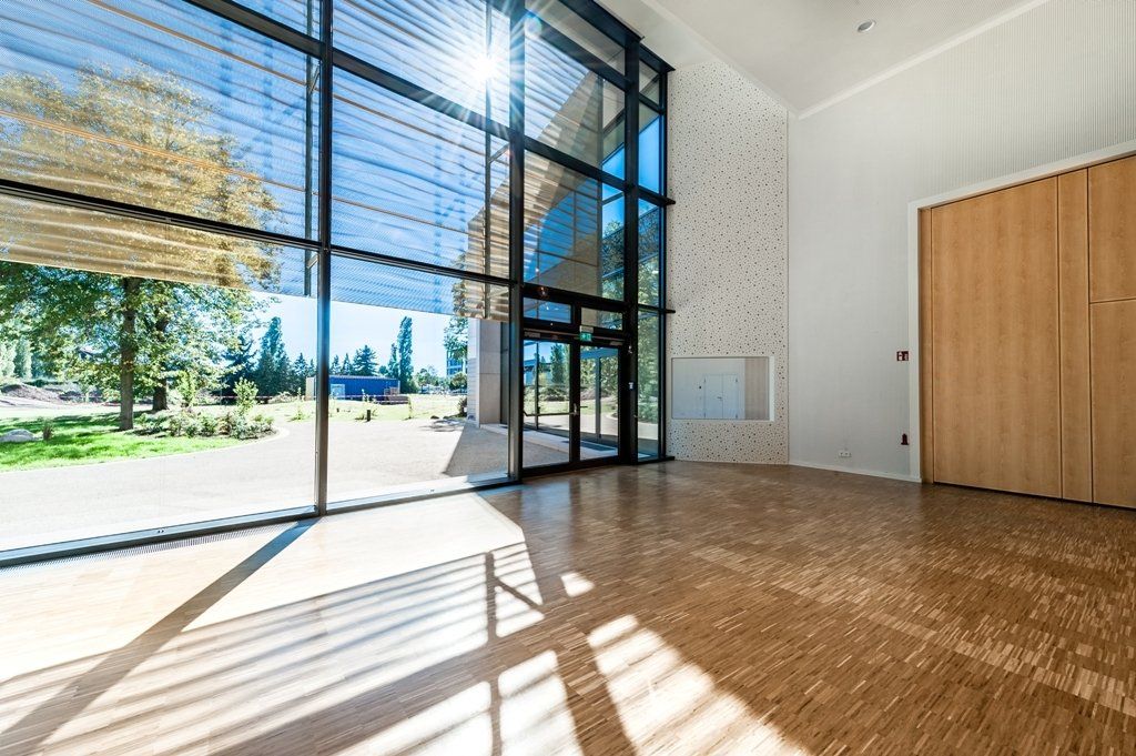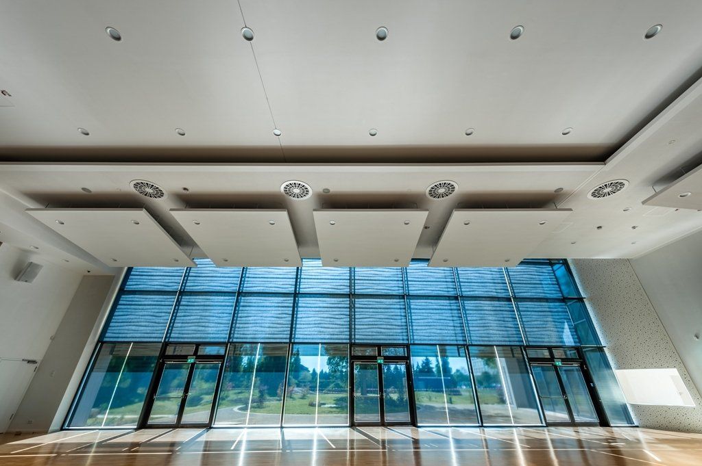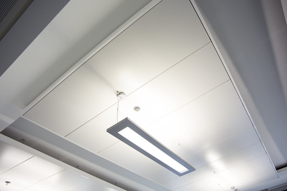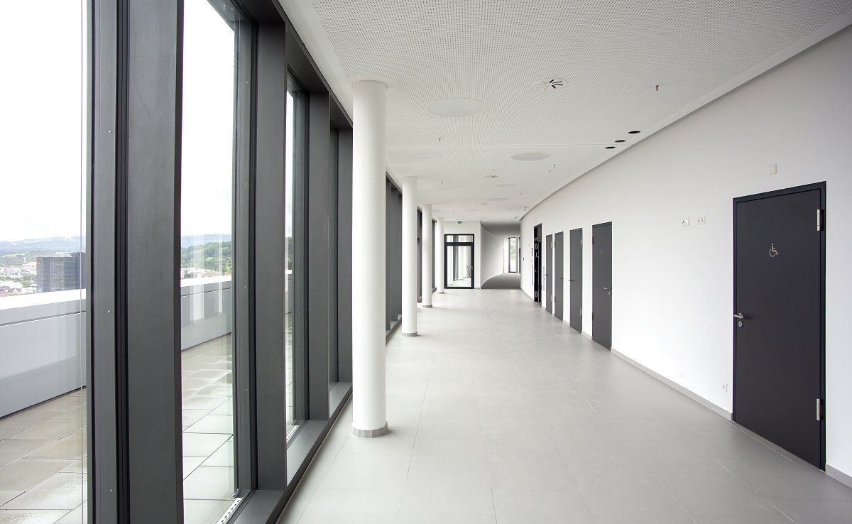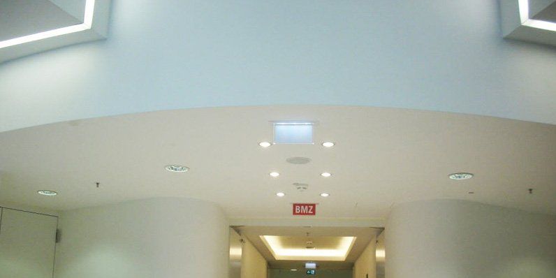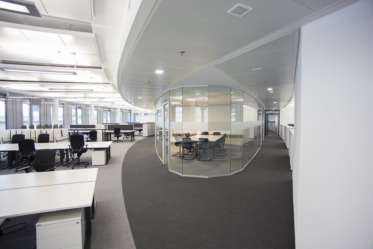 Ausführung: Abgehängte Decken als Heiz- und Kühldecken sowie Heiz- und Kühlsegel in geneigter Form ausgeführt, gekrümmten Wandelemente, Bauelemente mit hohen Anforderungen als Holz-Akustikwand-Verkleidungen schallabsorbierend und