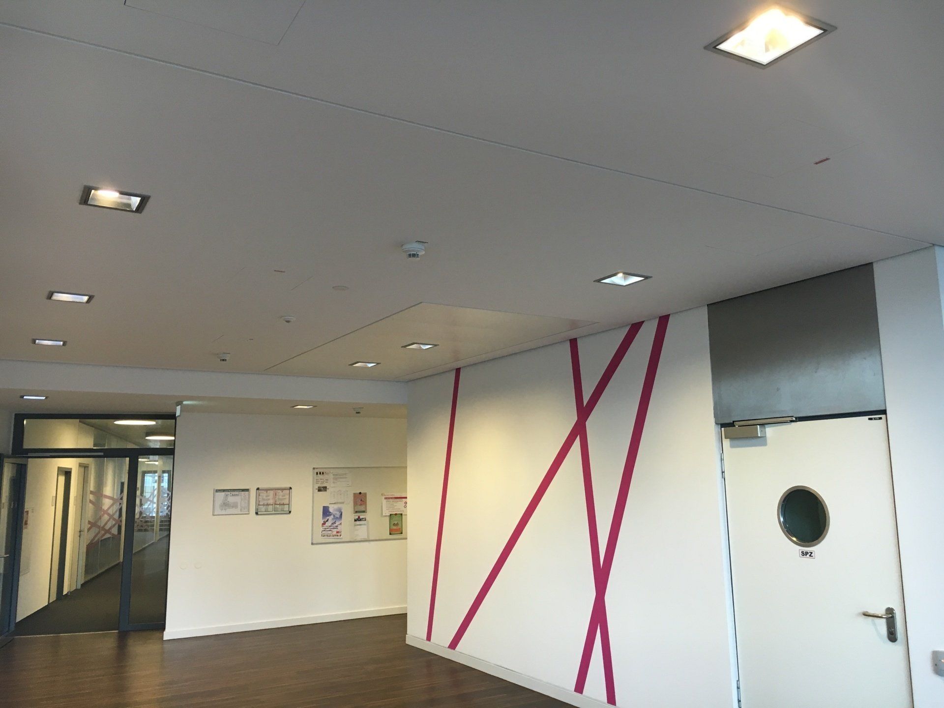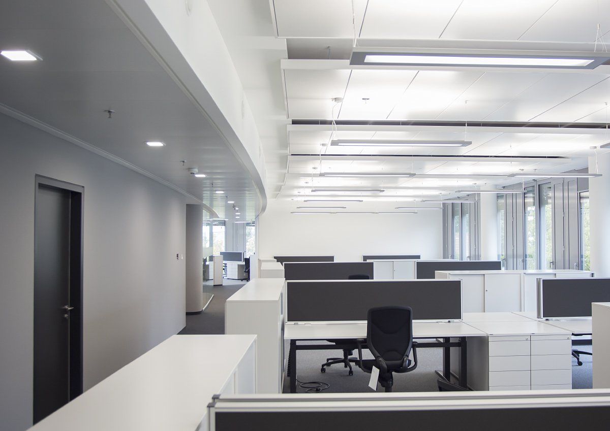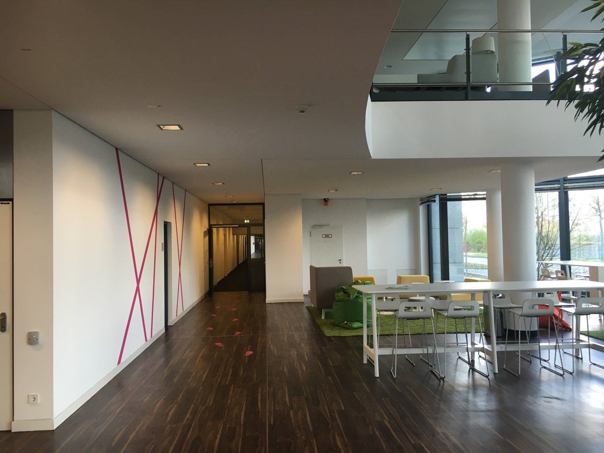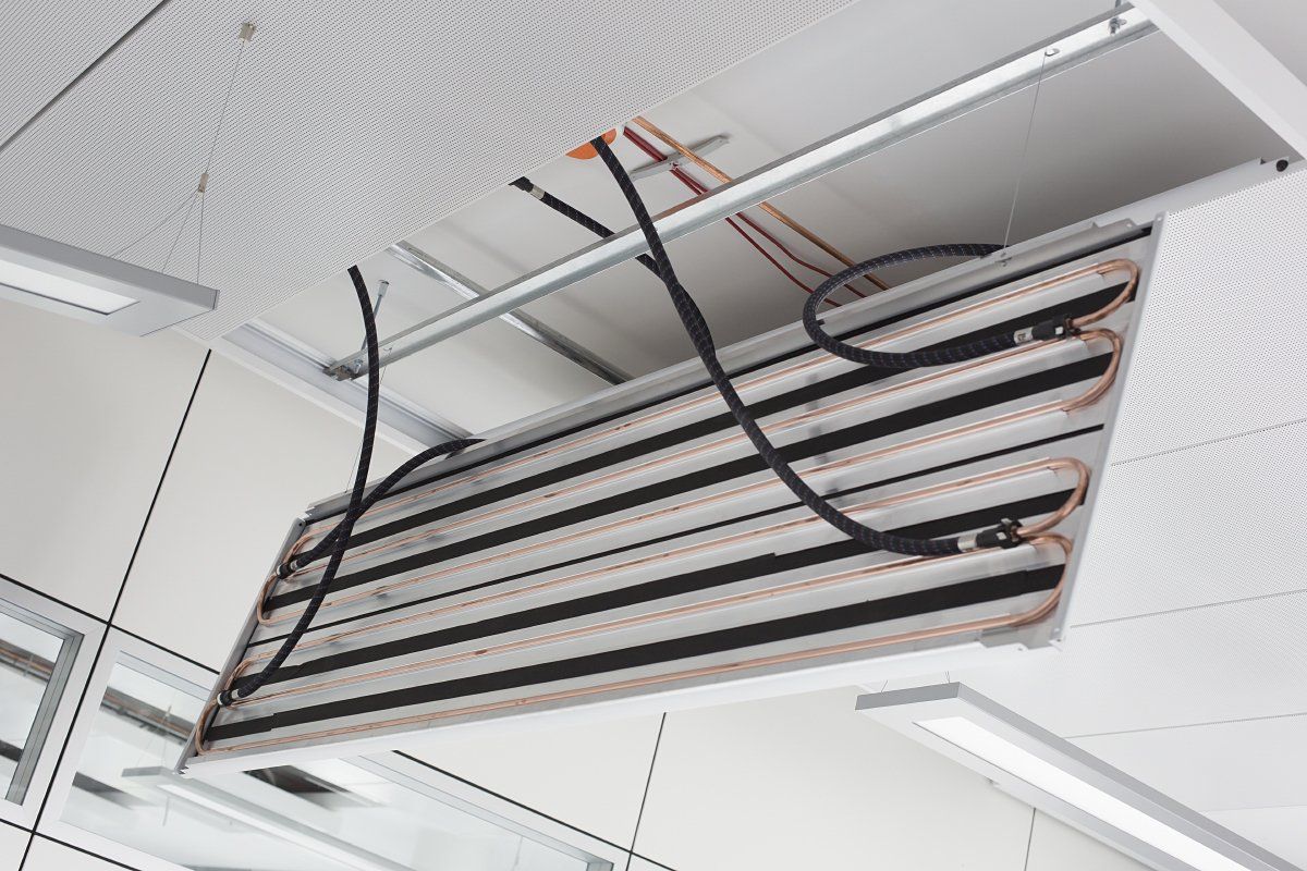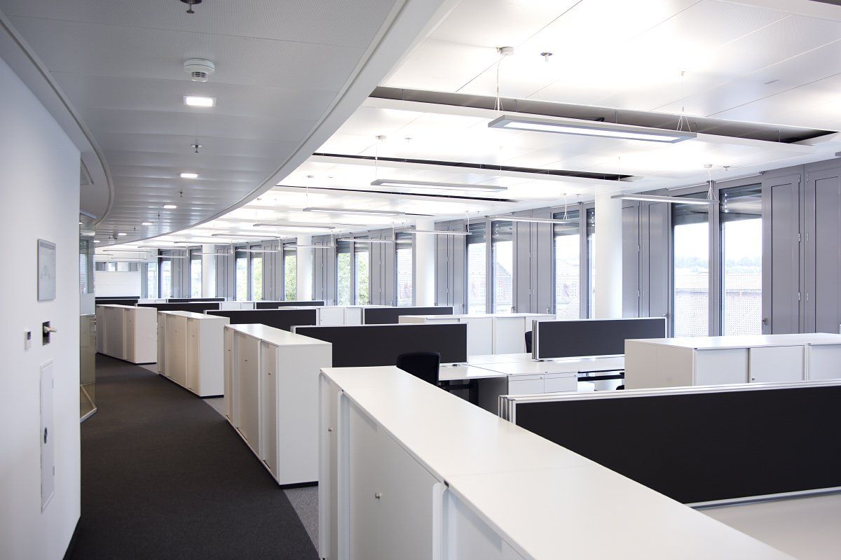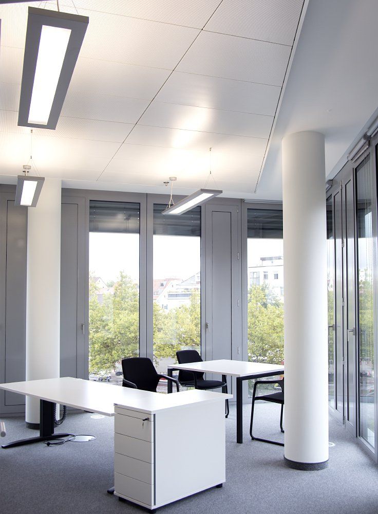 Ausführung: Abgehängte Decken als Heiz- und Kühldecken sowie Heiz- und Kühlsegel in geneigter Form ausgeführt, gekrümmten Wandelemente, Bauelemente mit hohen Anforderungen als Holz-Akustikwand-Verkleidungen schallabsorbierend und