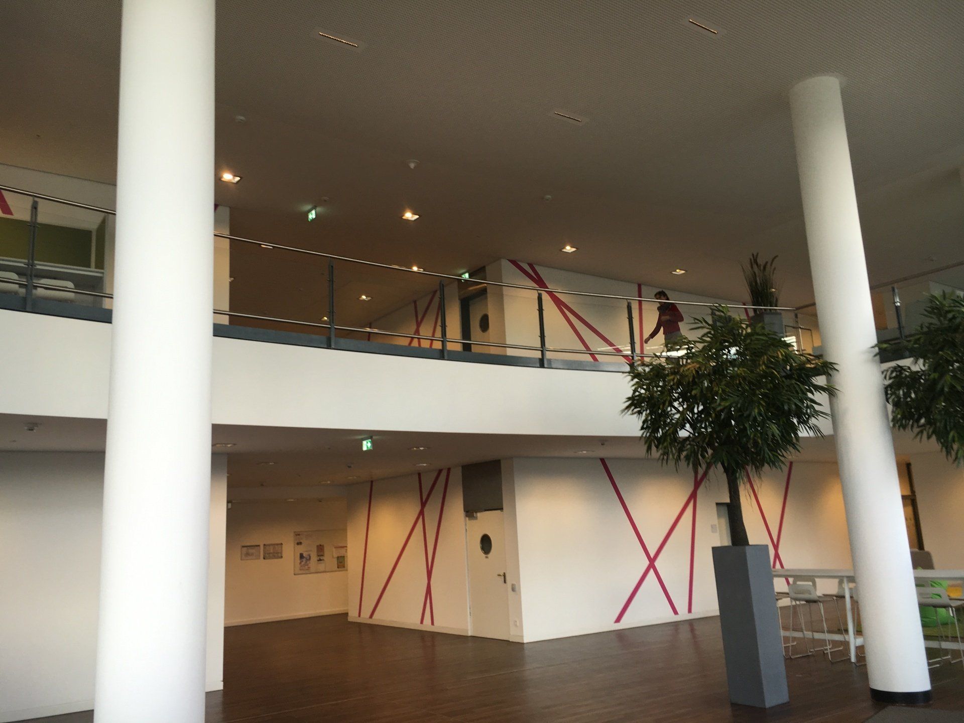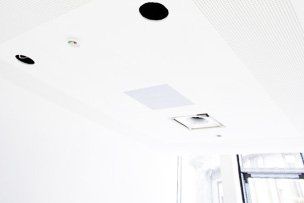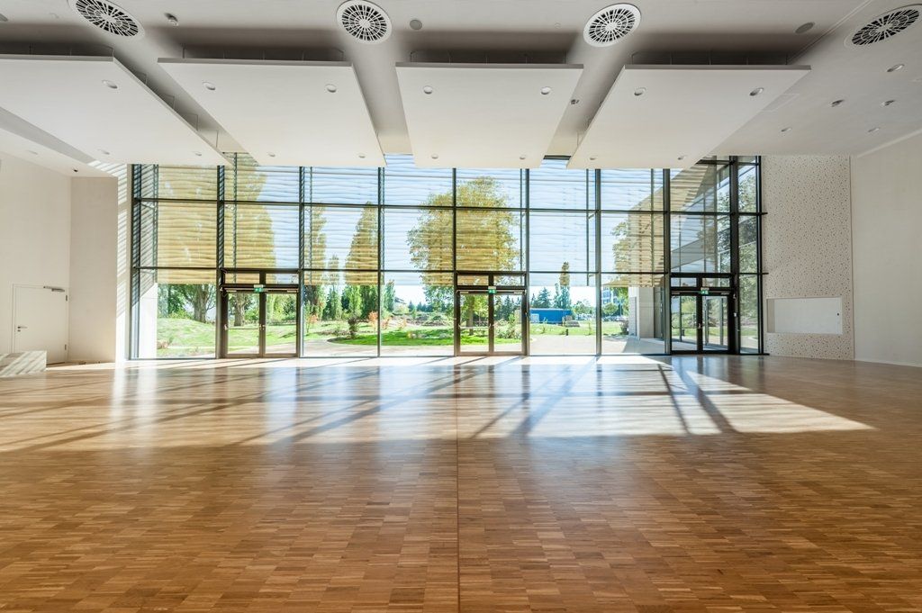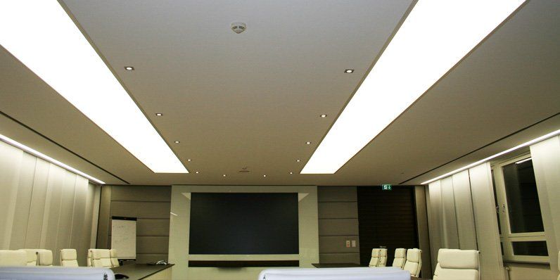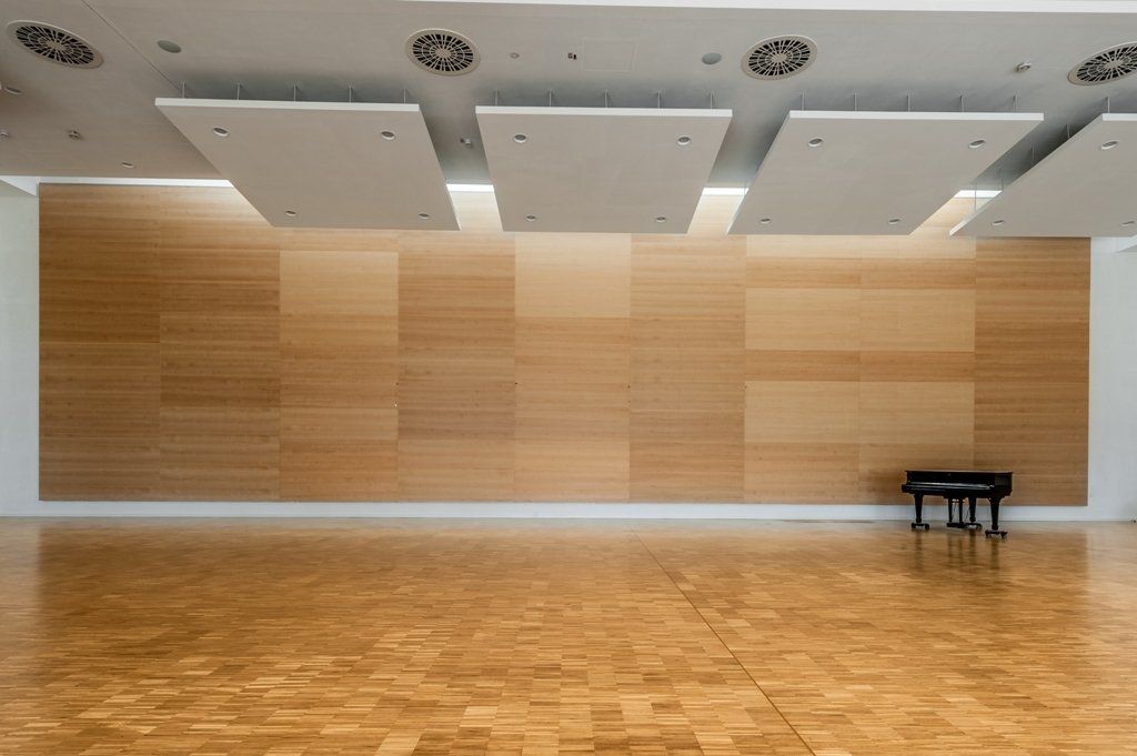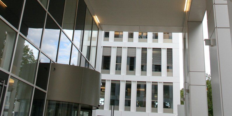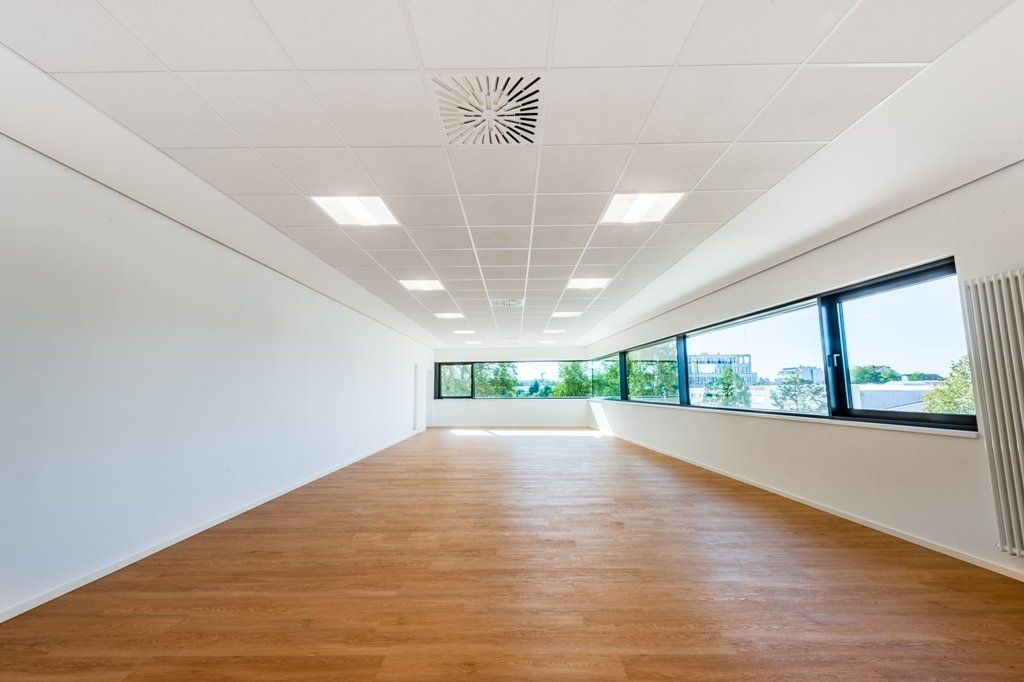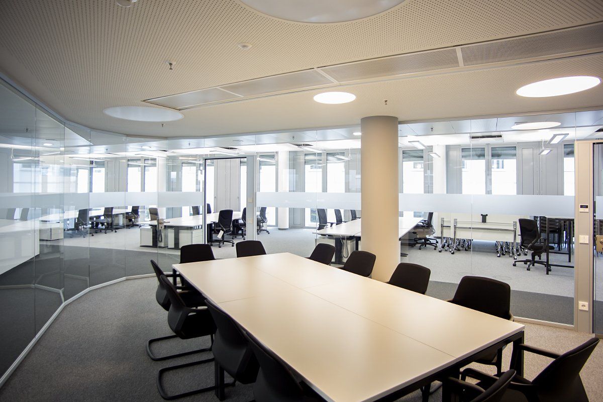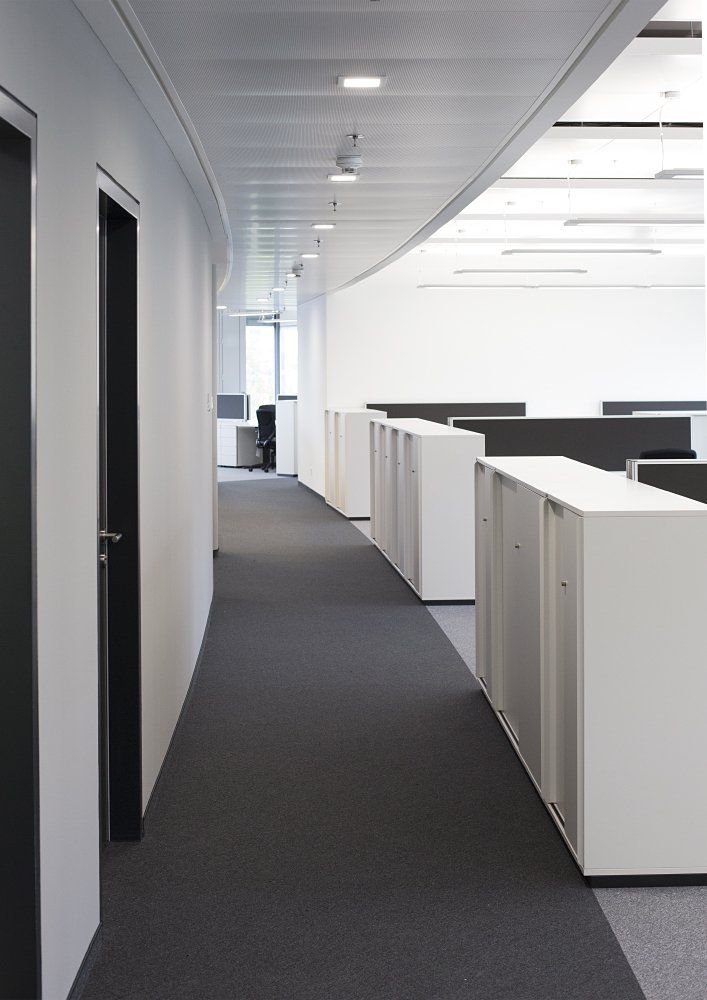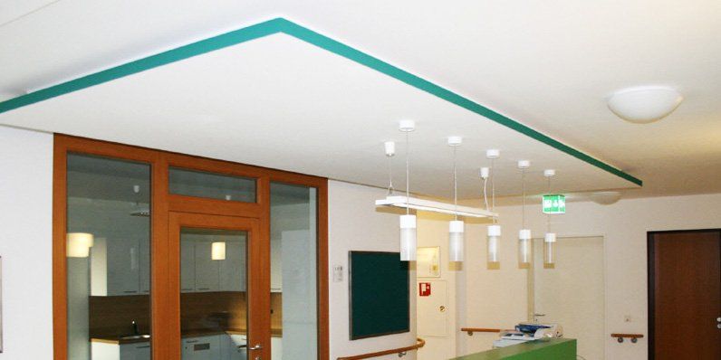 Ausführung: Abgehängte Decken als Heiz- und Kühldecken sowie Heiz- und Kühlsegel in geneigter Form ausgeführt, gekrümmten Wandelemente, Bauelemente mit hohen Anforderungen als Holz-Akustikwand-Verkleidungen schallabsorbierend und