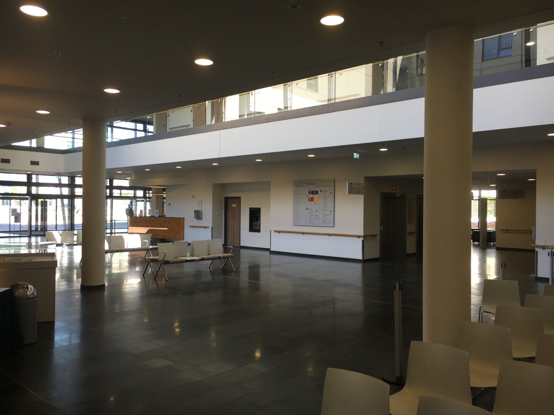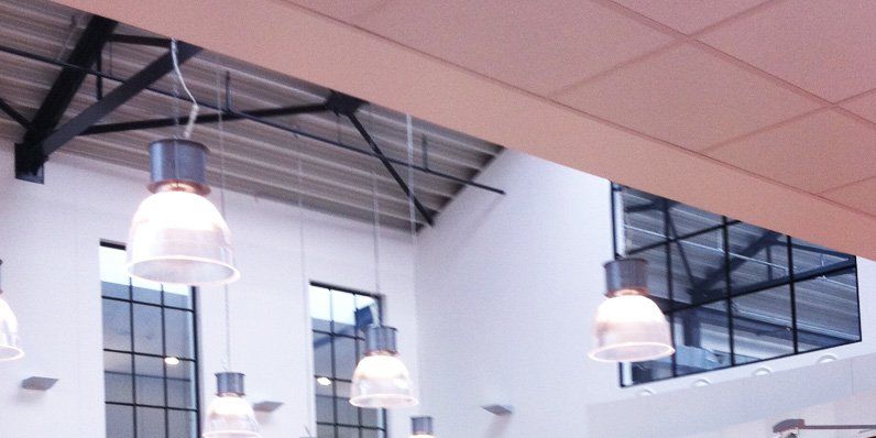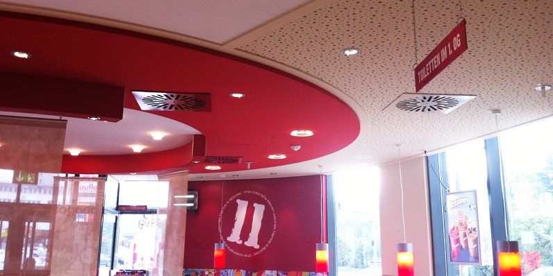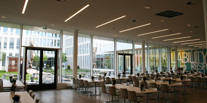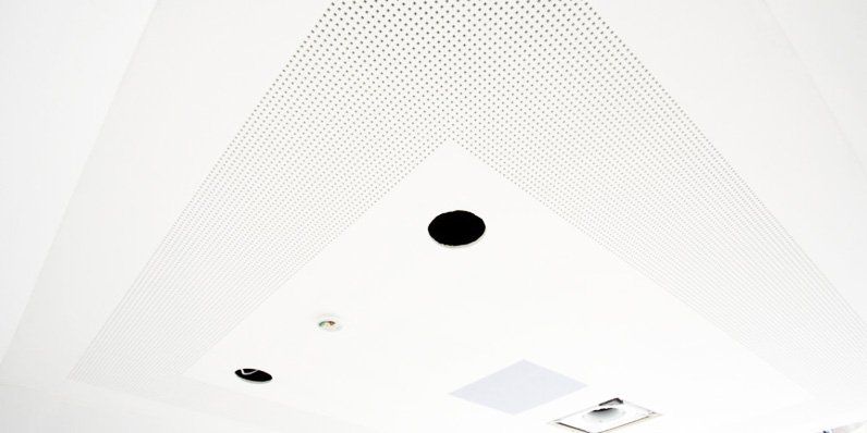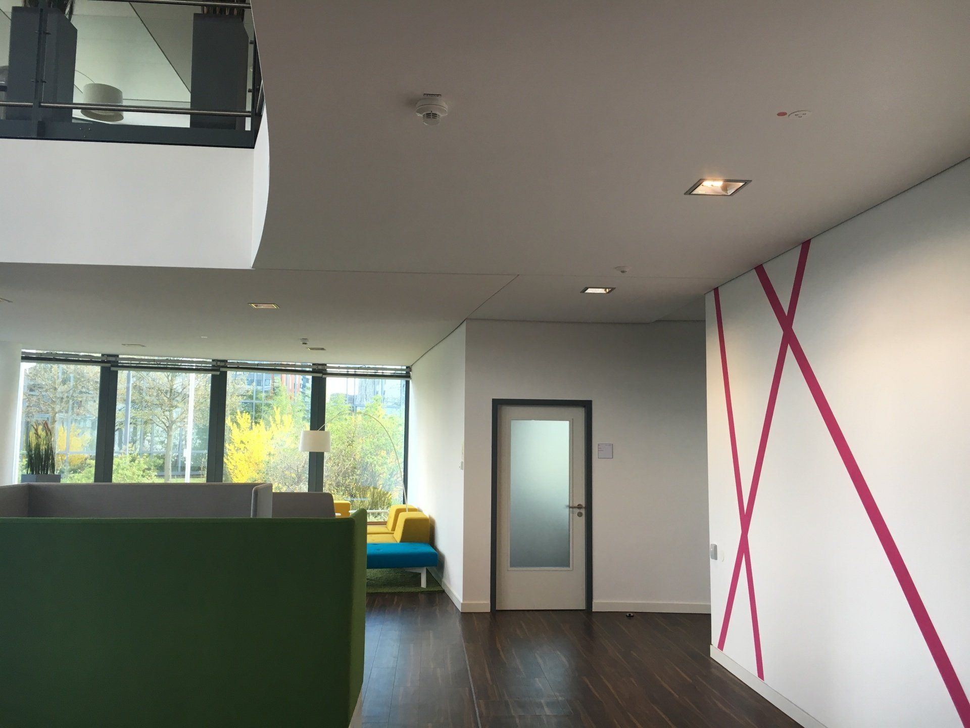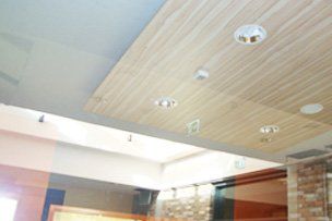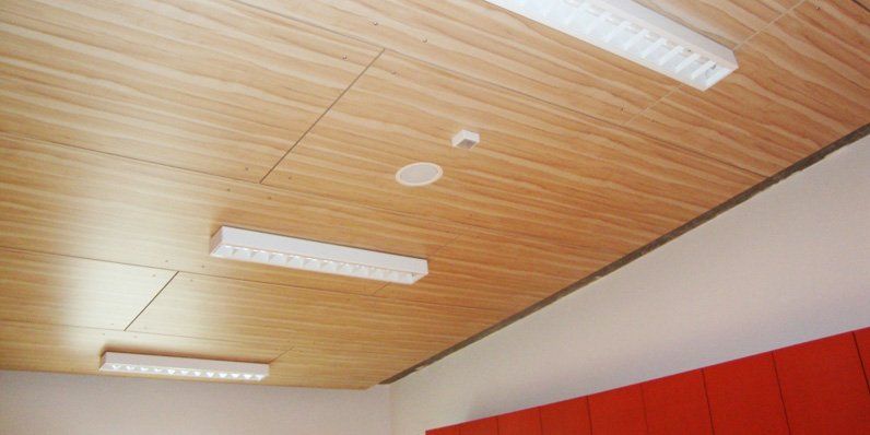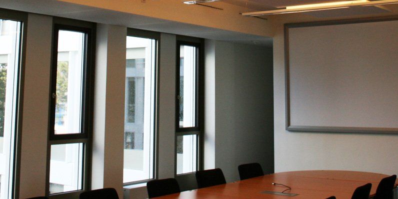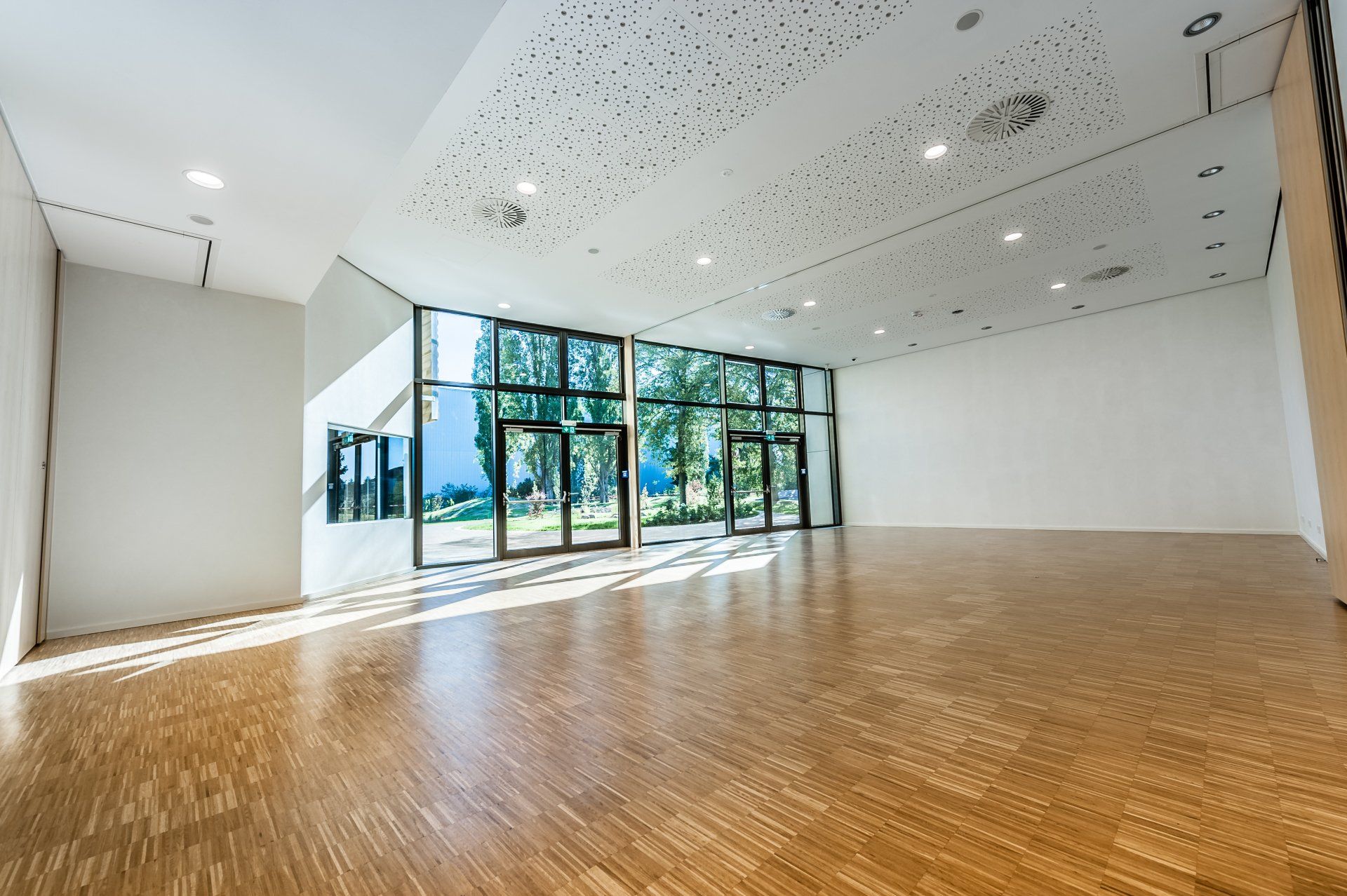 Ausführung: Abgehängte Decken als Heiz- und Kühldecken sowie Heiz- und Kühlsegel in geneigter Form ausgeführt, gekrümmten Wandelemente, Bauelemente mit hohen Anforderungen als Holz-Akustikwand-Verkleidungen schallabsorbierend und